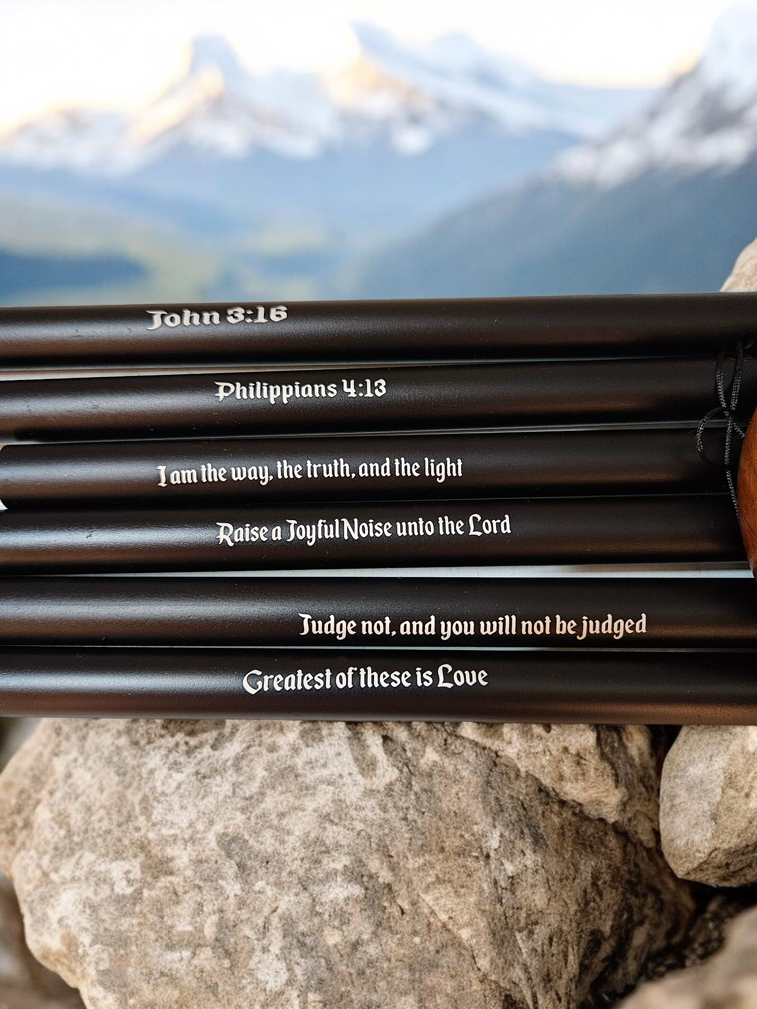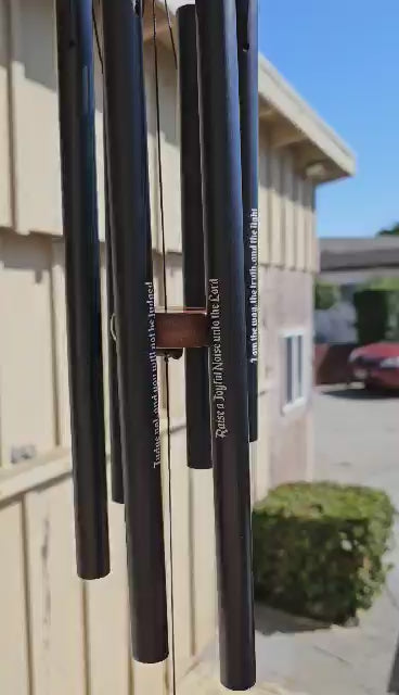 This 2 ft wind chime features a harmonious blend of wood and metal, producing lovely tones with each gentle breeze. Each rod is inscribed with a meaningful scripture, adding a touch of spirituality to your outdoor decor. The tang also features a scripture, making this wind chime a beautiful and uplifting addition to your home.