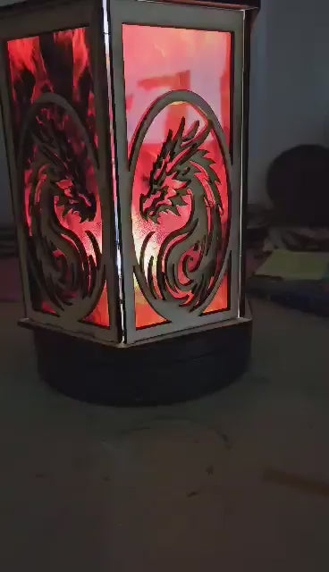 Illuminate your love for dragons with our 9x 5 inch lit Fire Dragon Lantern. Perfect for dragon lovers, this unique handcrafted lantern is a must-have addition to any collection. Get ready to be mesmerized by the intricate design and bring a touch of magic to your home. Please note the revolving table is not included. These Dragons are made to order so a 7 day lead time for processing is needed. Thank you!
