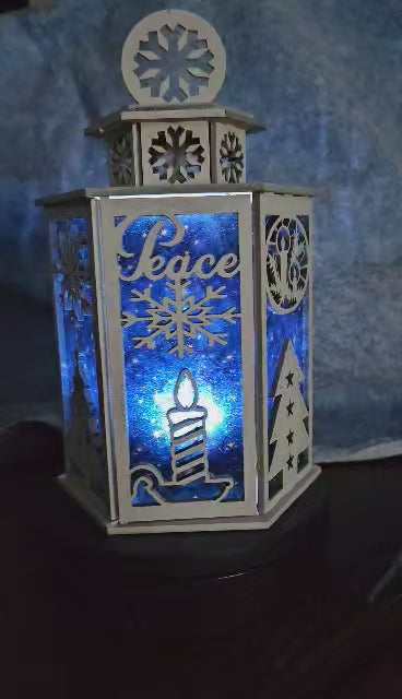 This beautiful "Silent Night" Christmas Lantern stands at 9 inches tall and 6 inches wide, featuring a soft blue starry overlay that symbolizes the peace of Christmas. Perfect for adding a touch of serenity and warmth to your holiday décor. Use with color changing Tea light( included) for a lovely soft effect. Shown with soft white light.